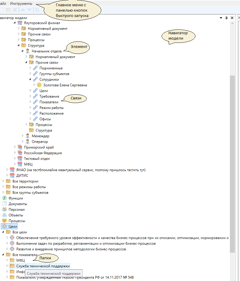 Дерево модели, отображаемое в окне Навигатора, состоит из следующих типовых компонентов: •элементы - объекты моделирования, характеризующие различные аспекты деятельности компании. Каждый элемент дерева имеет свой тип, который определяет его "поведение": допустимый набор свойств, связей с другими элементами и отчетов; •связи - узлы дерева, отражающие связи между элементами; •папки - узлы дерева, предназначенные для группировки однородных элементов.